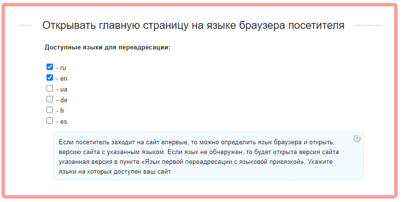 Added additional definition of the Visitor's Browser Language. When you visit the site without specifying the language ((/ru/ /en/ /ua/ /de/ /es/ /fr/), the version of the language specified in the browser will be opened. Specify the available language versions on your site to enable automatic redirects. If the language is not found, the main version of the site language specified in the site settings will be opened.