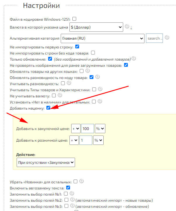 Added the function of automatic markup during import. It is possible to use a manually specified margin, depending on both the "Purchase price" cell and the "Price" - retail price cell. In addition, the priority field "Markup" is taken into account, which may be present in your price file.