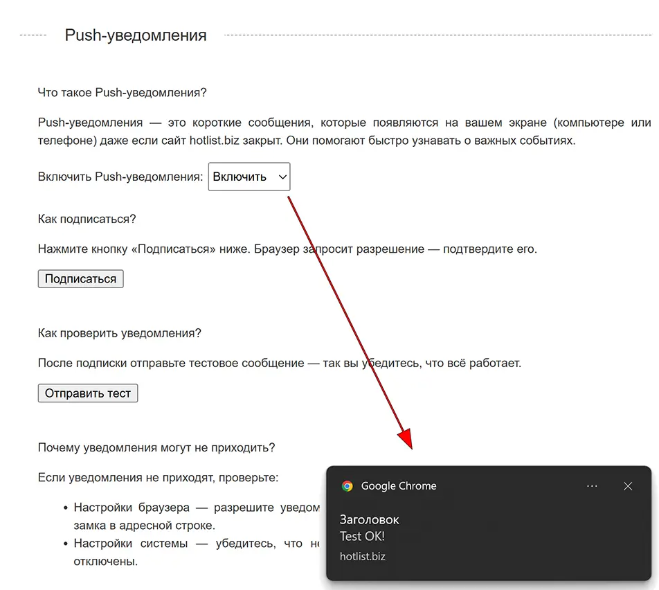 Push notifications have been added. Push notifications are short messages that appear on your screen (computer or phone) even if your site or hotlist.biz is closed. They help you quickly learn about important events: orders, messages, import completion, feedback.