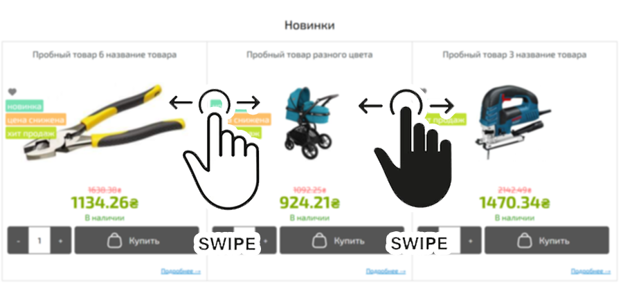 Now in our product widgets there is a swipe effect, activated using the code :touch in the block settings.