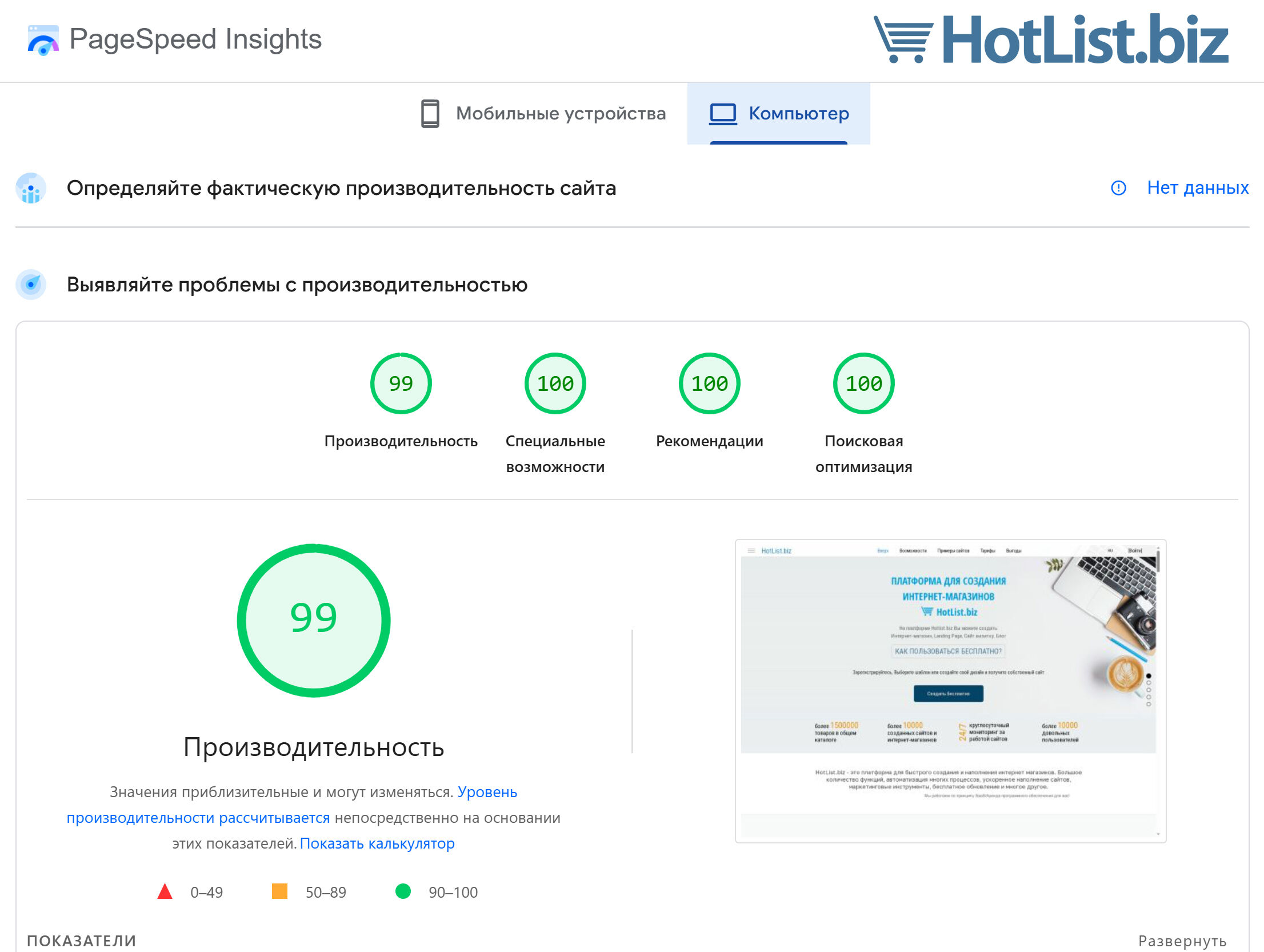 Our actual score for optimization – 99%, 100%, 100%, 100%, which is practically a fantastic result.