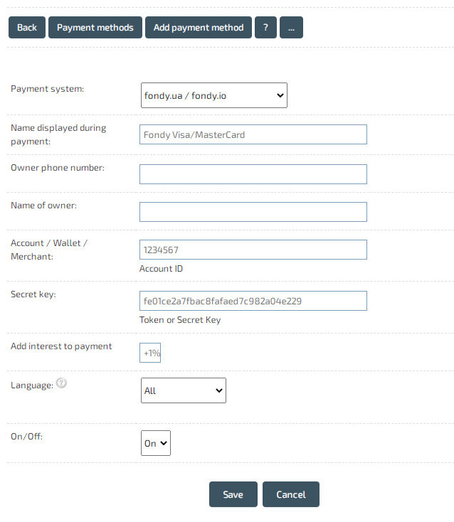 Wybierz «Fondy.ua / Fondy.io» i uzupełnij otrzymany `Merchant ID` - Konto oraz `Payment key` - Secret key.
