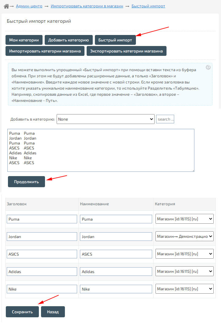 Dodano «Szybki» import kategorii sklepu. Listę kategorii z "Tytułem" i łacińską "Nazwą" można skopiować ze schowka np. z "Excel".