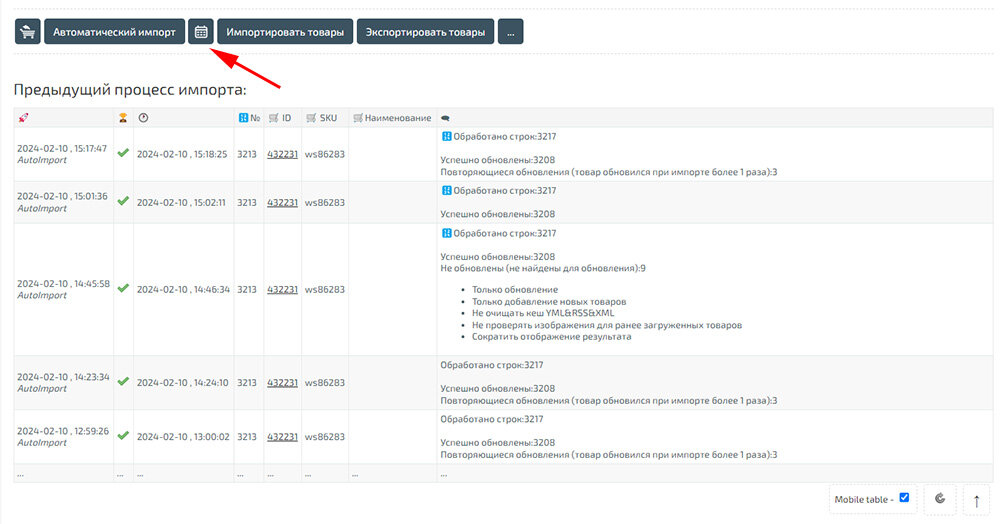 Na tej stronie możesz wyświetlić 8 najnowszych wyników importu. W tym panelu zobaczysz Kod i ID produktu, a także linię, w której zakończył się proces importu. W przypadku importu dużej ilości danych strona umożliwia prześledzenie linii, w której import został przerwany.
