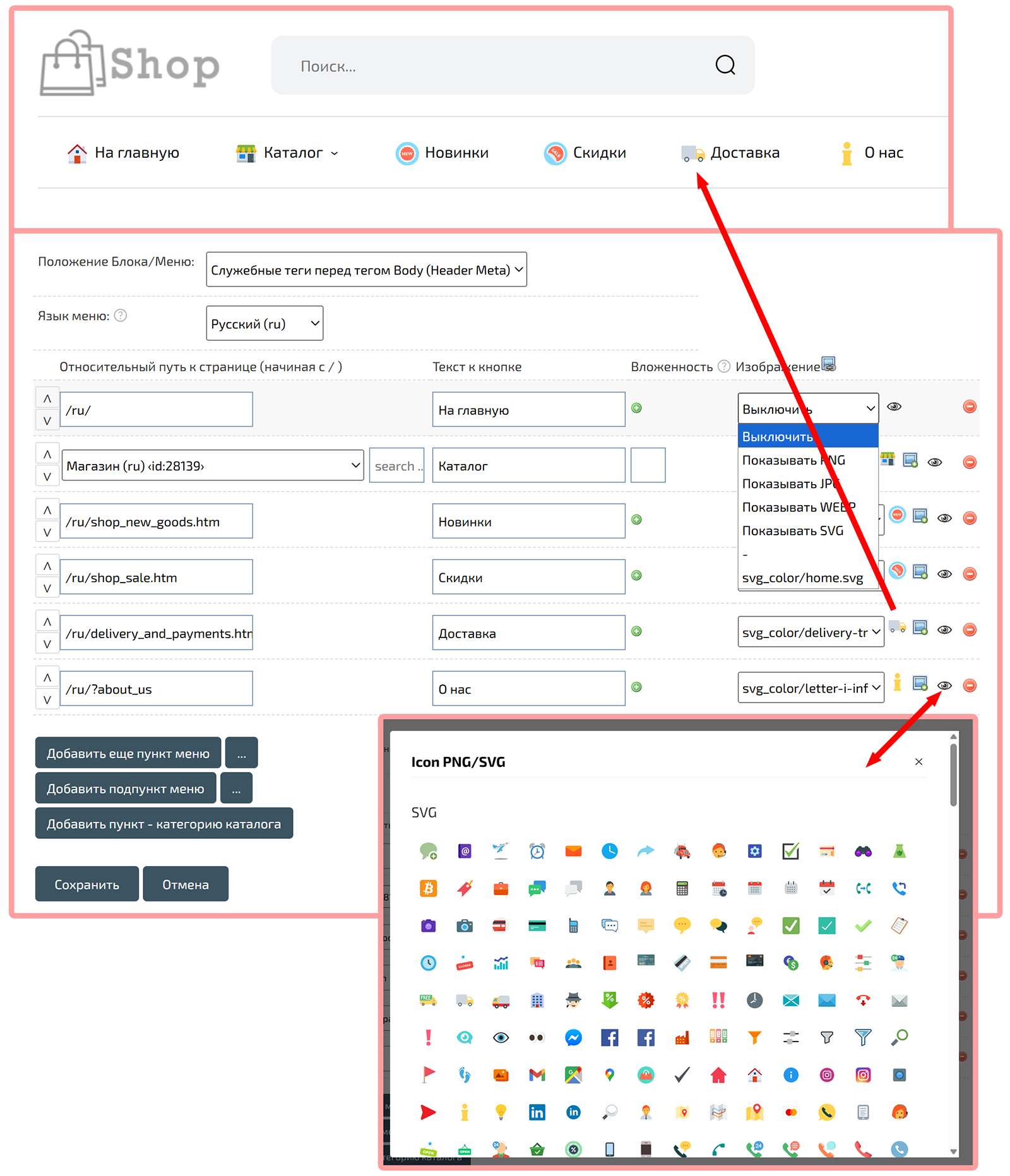- Obsługiwana jest również możliwość wgrywania własnych ikon w formatach SVG, WEBP, PNG, JPG;