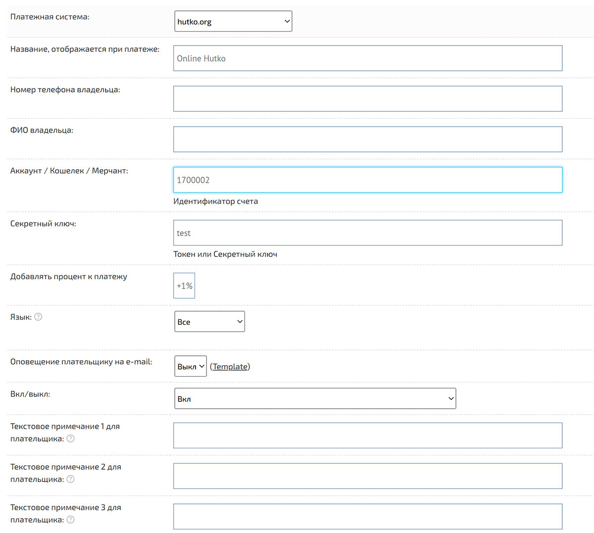 Выберите "Hutko.org" и заполните поля: `ID мерчанта` — Аккаунт, `Ключ оплаты` — Секретный ключ.