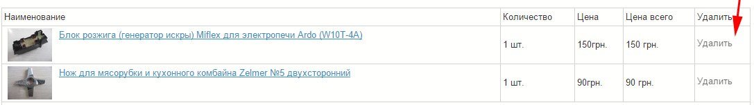 Стандартная иконка удаления товара из корзины заменена на текст.