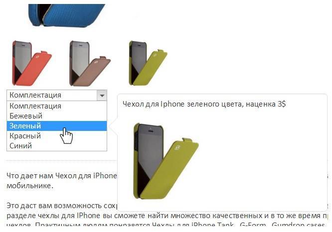 Выпадающий список комплектаций - комплектация будет в виде select списка, при нажатии на который будет отображены все варианты комплектаций, а в подсказке будет видны их описания. При выборе комплектации меняется цена и артикул товара.