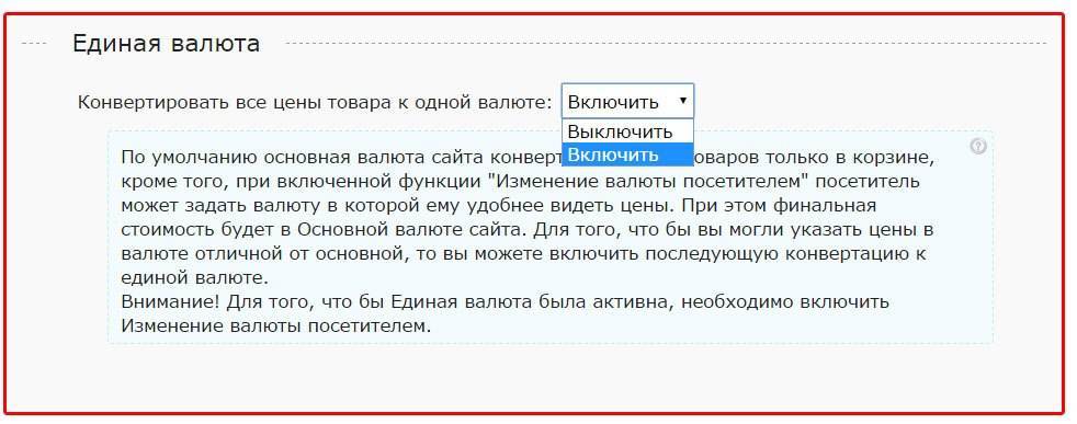 Например, вы продаете товар в России в рублях, но закупка происходит в долларах. Укажите цену товара в долларах, и включите Единую валюту,указав рубль в качестве основной валюты сайта. После чего посетители будут видеть цену товара в рублях.