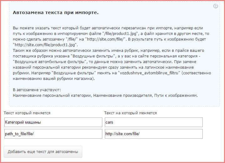 Таким же образом можно автоматически заменить имена рубрик, например, если в прайсе вашего поставщика рубрика указана "Воздущные фильтры", а у вас на сайте персональная категория - "Воздушные автомбильные фильтры", то данные можно заменить автоматически. При замене названий персональной категории рекомендуем сразу заменять на латинское наименование рубрики. Например "Воздущные фильтры" менять на "vozdushnye_avtombilnye_filtru" (соотвественно наименованию вашей рубрики магазина).