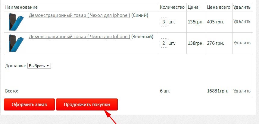 Добавлена кнопка "продолжить покупки".