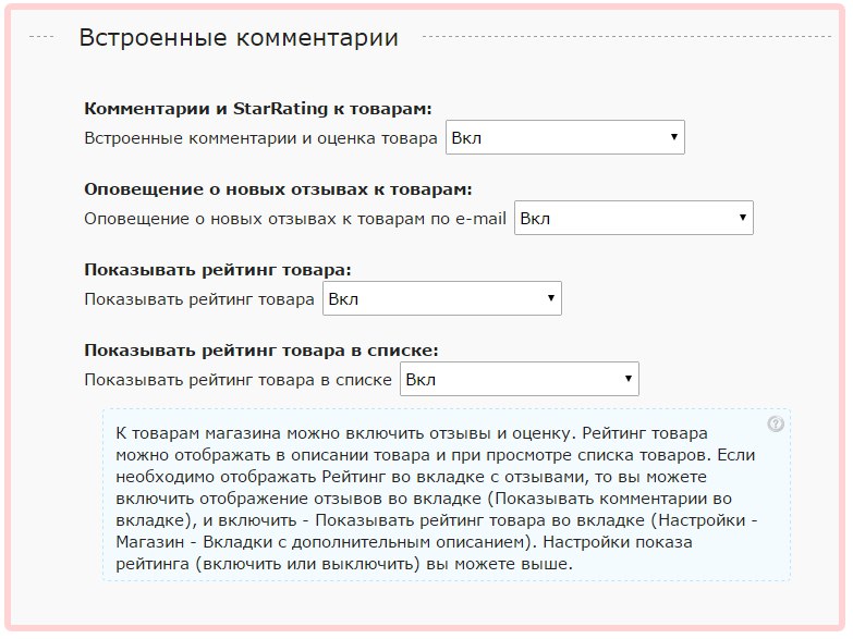 Рейтинг можно отображать как в списке товаров, так и при его отдельном просмотре. Настройки осуществляются во вкладке "Комментарии и социальные плагины".