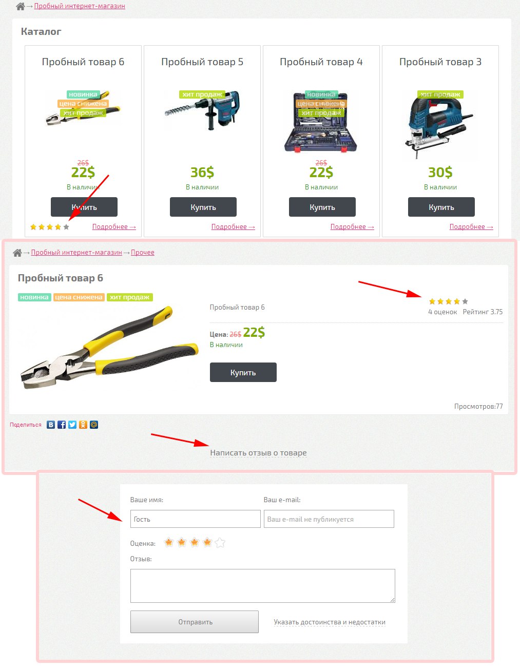 Добавлен Рейтинг и Отзывы к товару.