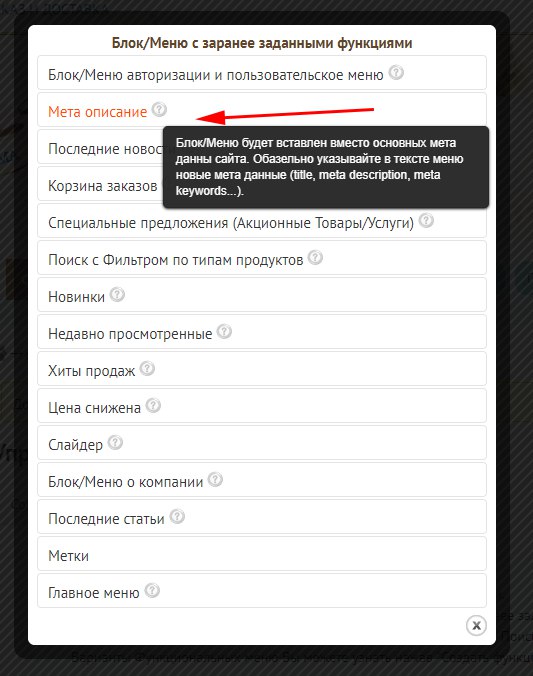 Добавлен блок/меню "Мета данных". При добавлении данного блока, основные мета данные перезаписываются. Таким образом появилась возможность указать индивидуальные неповторимые мета данные для поисковых запросов.