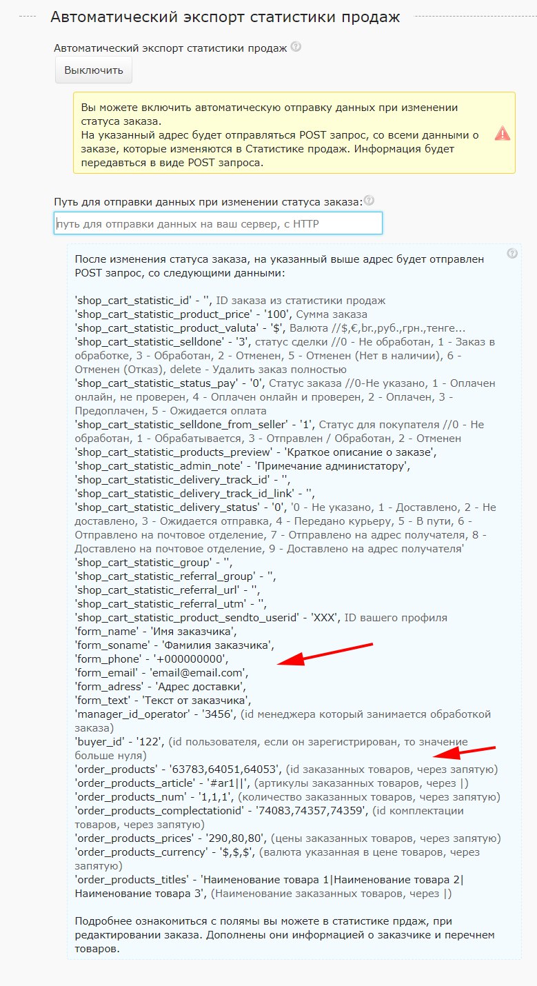 Добавлены поля с информацией о заказчике, а так же список товаров, артикулов и цен, к автоматической отправке запроса статистики продаж (при изменении/сохранении заказа в статистике продаж).