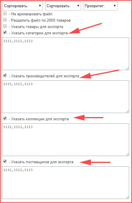 Добавлена возможность выбирать Категории, Коллекции, Производителей и Поставщиков, при экспорте товаров.