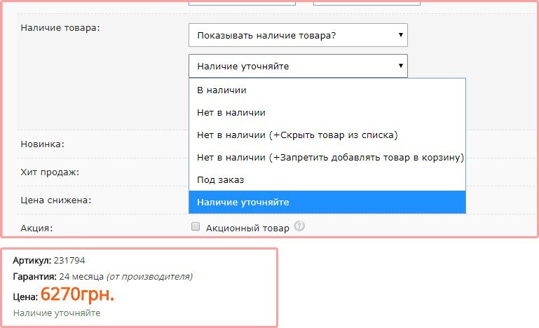Добавлен пункт "Наличие уточняйте" в информацию о наличии.