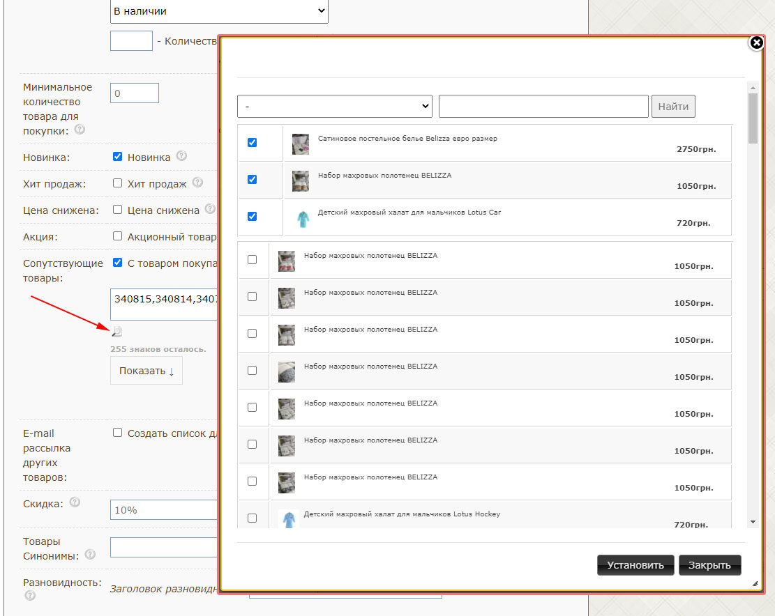 Добавлено всплывающее окно для управления списком "Сопутствующие товары", "Товары синонимы" и "E-mail рассылка других товаров".