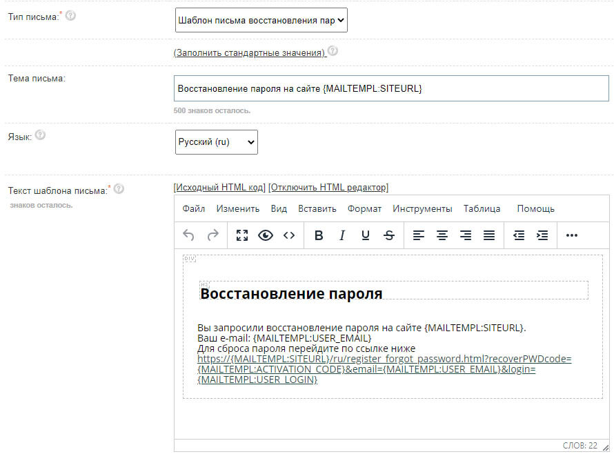 Добавлен редактируемый шаблон письма для восстановления пароля.