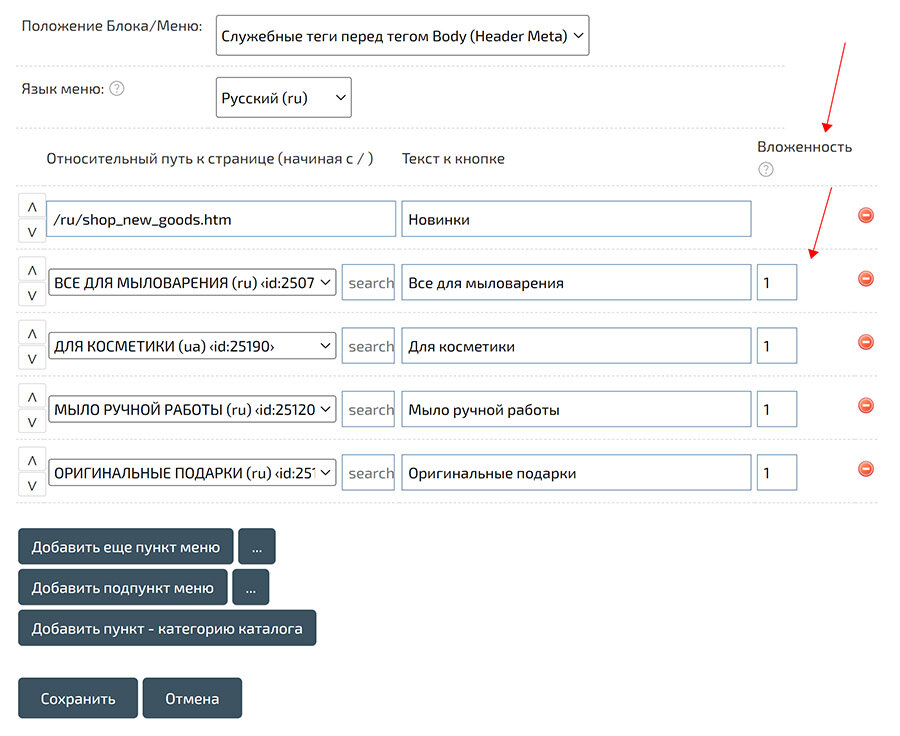 Добавлен параметр "Уровень вложений" в пунктах главного меню. Параметр позволяет ограничить количество вложений, если пункт содержит множество подпунктов с дочерними подкатегориями.