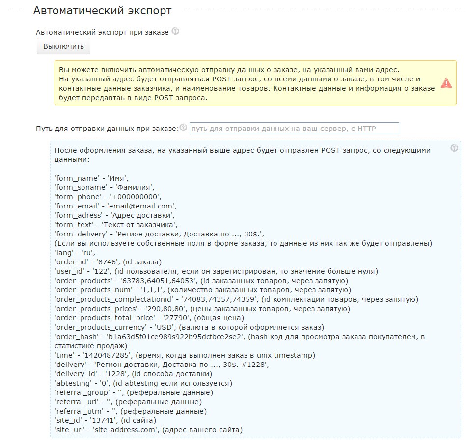 Полный перечень отправляемых данных вы можете увидеть в НАСТРОЙКАХ, во вкладке МАГАЗИН, в подсказках к параметрам автоматического экспорта заказываемых товаров.
