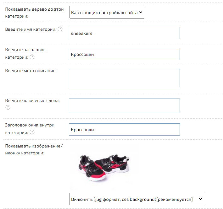 К категориям можно Загрузить иконку, а также отображать «Количество вложенных карточек товаров» (в нашем примере - количество кроссовок).