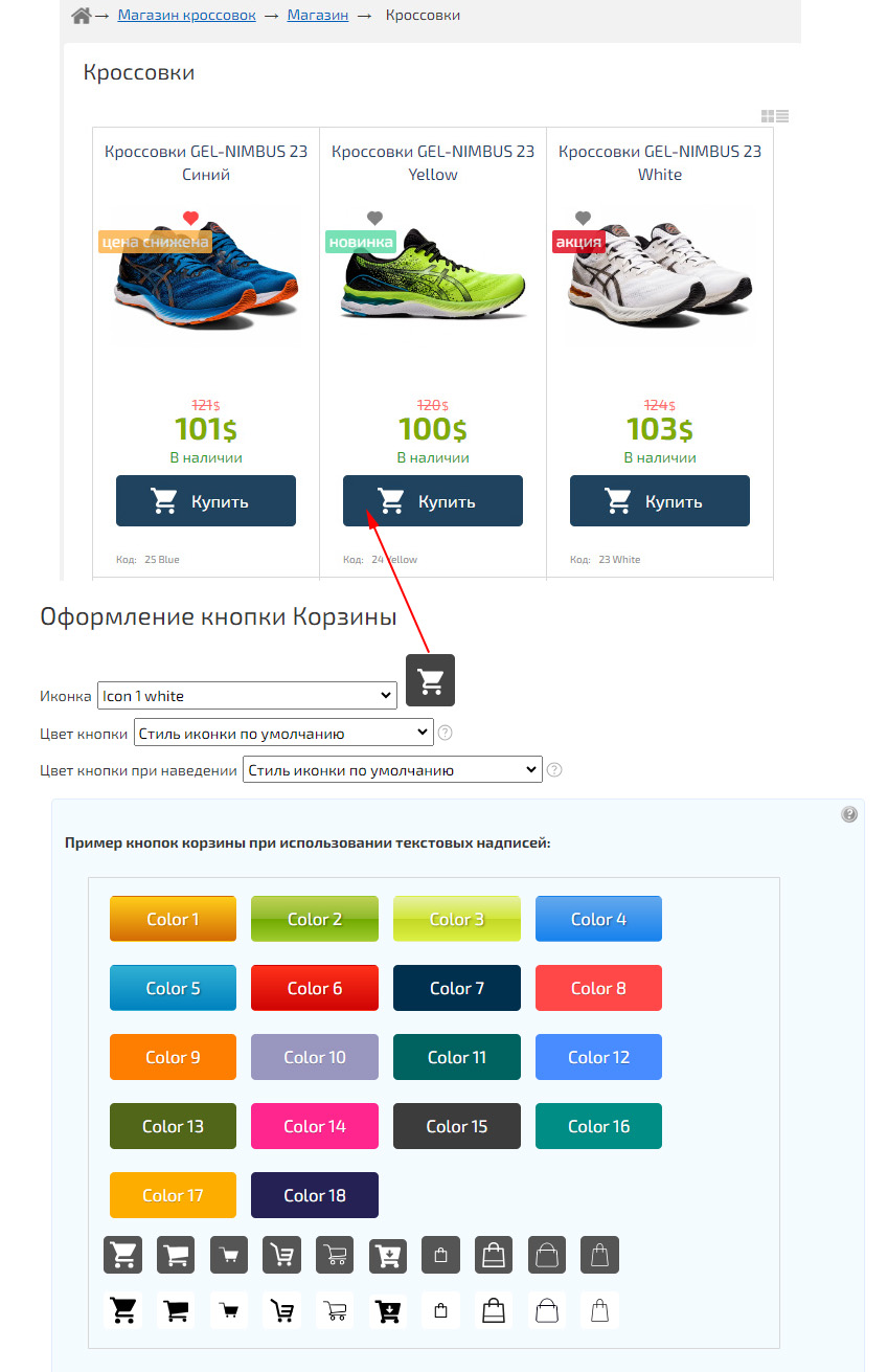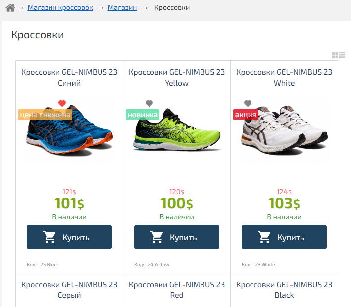 Например, можно отображать только «Новинки», добавить кнопку «Корзины» и «Добавить в избранные», указать количество отображаемых товаров, а также изменить параметры добавления следующих по списку товаров (прокрутка или кнопка «Показать еще»).