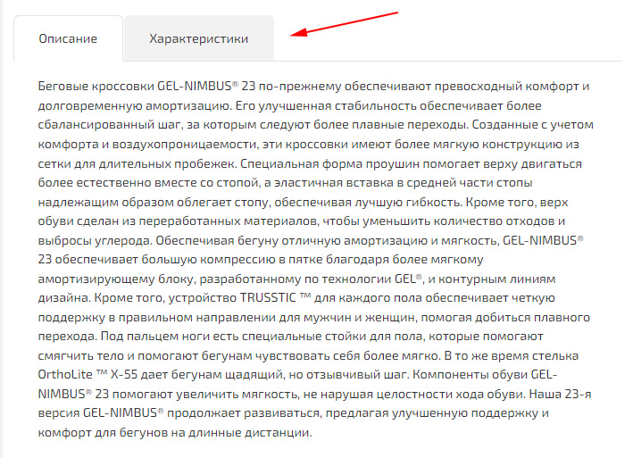 Доступно использование пяти вкладок, а также дополнительные встроенные вкладки, такие как: «Отзывы», «Характеристики», «Изображения», «С товаром покупают», «Другие товары этой коллекции».