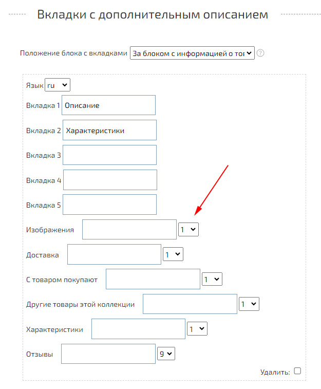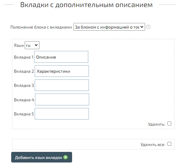 В пункте «Вкладки с дополнительным описанием» нажмите «Добавить язык вкладки», укажите необходимый язык перевода и заполните названия вкладок.