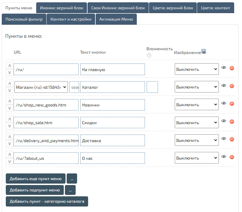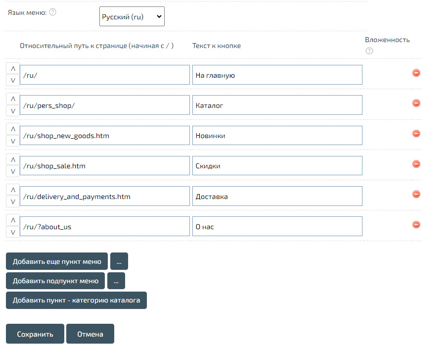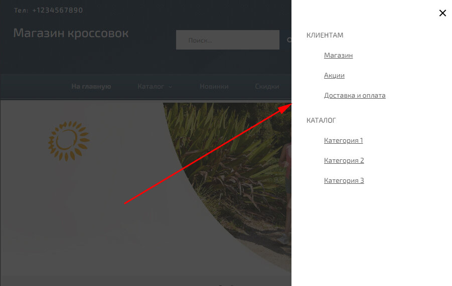 Вы можете добавить необходимые ссылки на страницы и категории, изменить порядок их расположения или создать раскрывающийся пункт с категориями магазина.