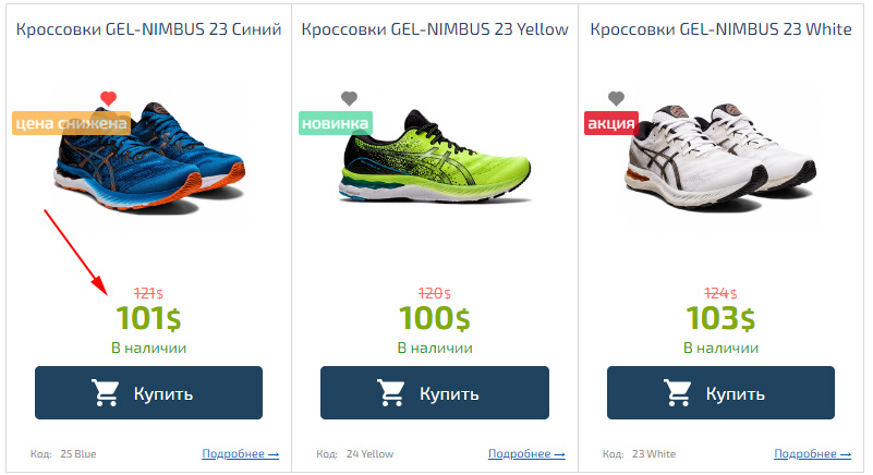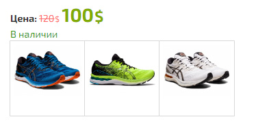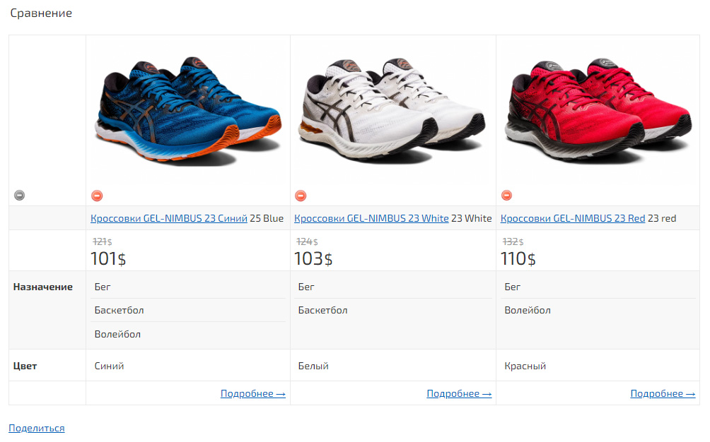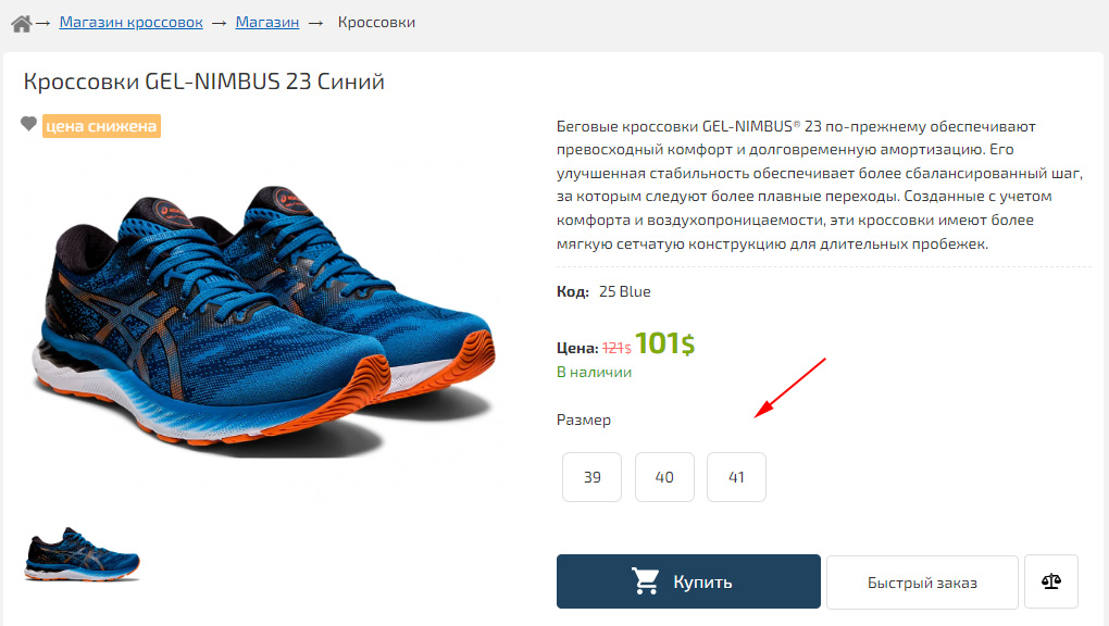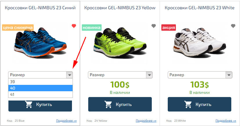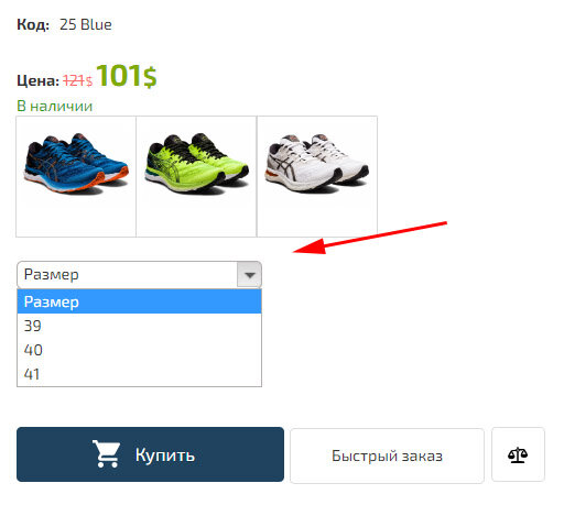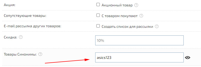 Для отображение переключателя с одного товара на другие, похожие товары, например, разного цвета, можно использовать «Товары синонимы». Например, для всех кроссовок одной модели разного цвета укажем во вкладке «Разновидности», в пункте «Товары Синонимы», одинаковые значения, например, «asics123».