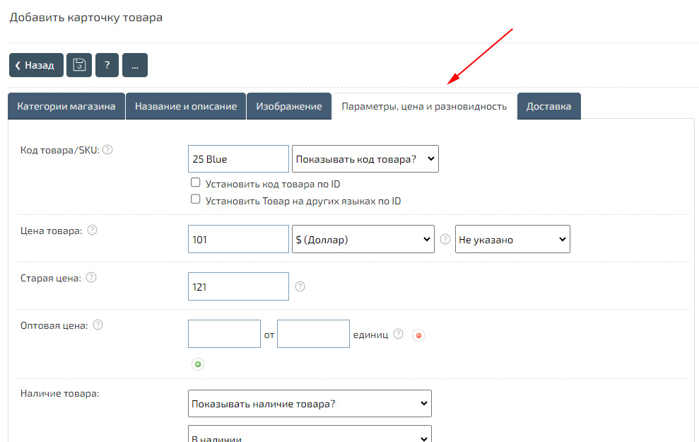Заполните все необходимые данные, например, «Название», «Цену», «Категорию», «Изображение товара» и «Описание». Для добавления «Карточки товара» обязательно необходимо указать «Наименование». Все дополнительные инструкции вы можете узнать на странице добавления товара, нажатием на иконку «?» -