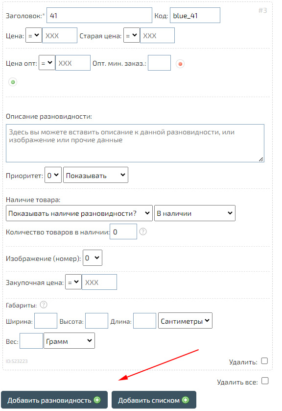 В разновидностях можно использовать собственные описания, цены, артикулы, а также изображения. Вы можете указать любые варианты разновидностей, а также, если необходимо разделить товары и по размеру и по цвету, то можно использовать пункт «Товары синонимы».