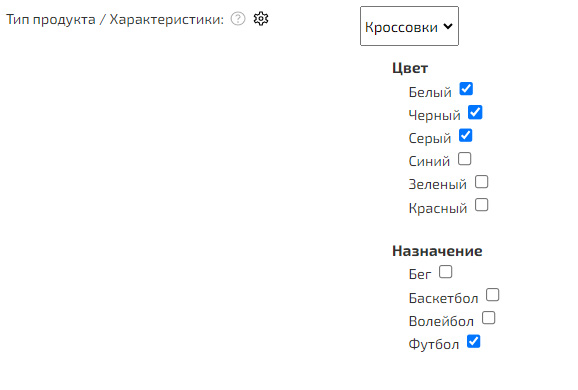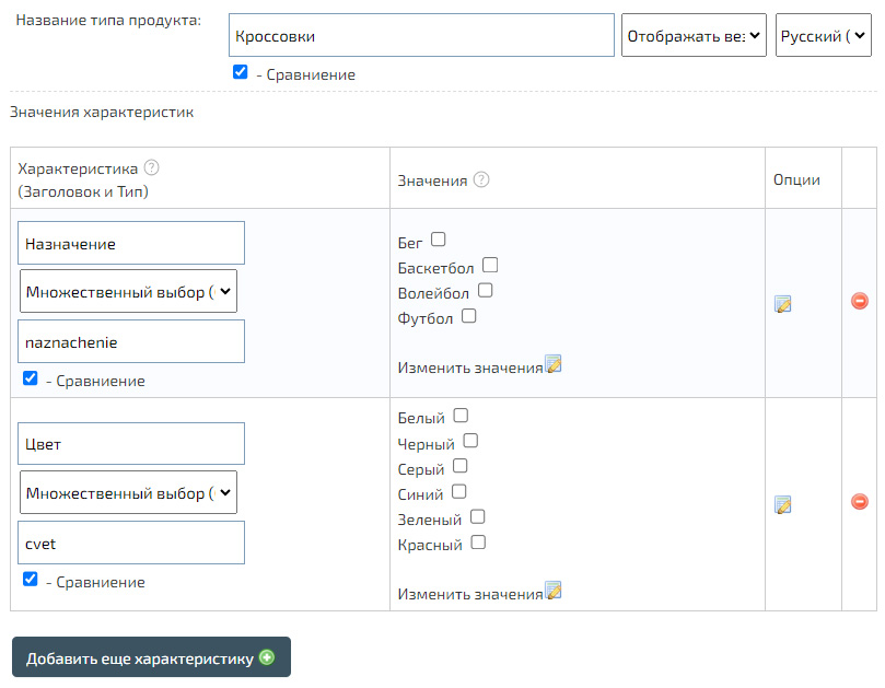 Добавьте необходимые виды характеристик, а также их значения. Например, «Кроссовки».