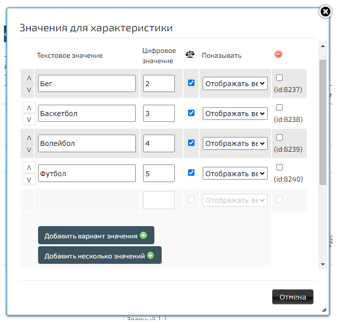 Например, Заголовок - «Назначение», Тип - «Множественный выбор». Значения: «Бег», «Баскетбол», «Волейбол», «Футбол».