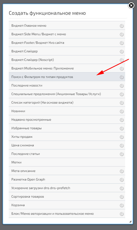 Выберите «Создать функциональное меню» и нажмите «Поиск с Фильтром по типам продуктов».