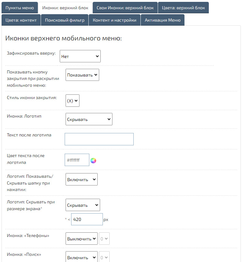 Укажите необходимые иконки. В меню можно добавить автоматическое открытие «Поискового фильтра», загрузку собственного контента любой страницы при нажатии, а также всплывающие формы «Обратный звонок» и «Обратная связь». Вы можете выключить отображение «Шапки» и «Главного меню», а также после добавления «Мобильного меню: Приложения» рекомендуем выключить стандартную «Мобильная кнопку» в «Редакторе дизайна» во вкладке «Главное меню».