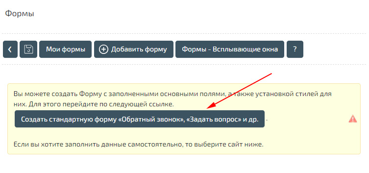 Это можно сделать в разделе «Мои формы» - «Добавить форму». Для того, что бы не заполнять все возможные поля и параметры, воспользуйтесь быстрым созданием формы, нажав «Создать стандартную форму “Обратный звонок”, “Задать вопрос”».