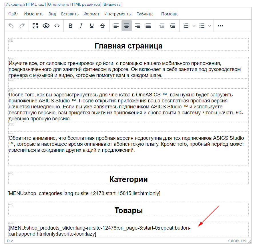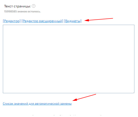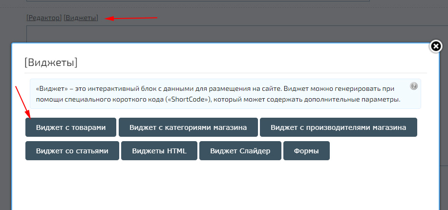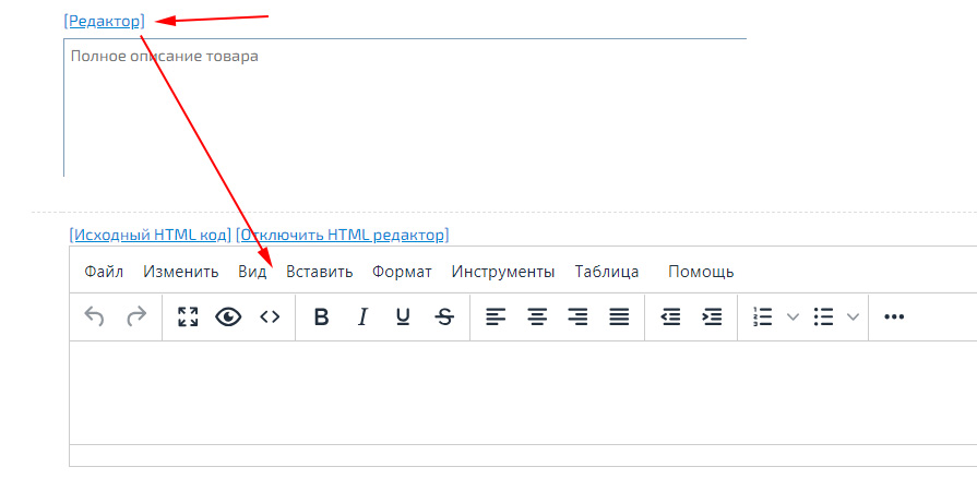 Все текстовые данные на сайте можно вставлять при помощи встроенного редактора. Для его включения нажмите на ссылку «[Редактор]», которая расположена над блоком для вставки текста (страниц, блоков/меню, описаний товара и других).