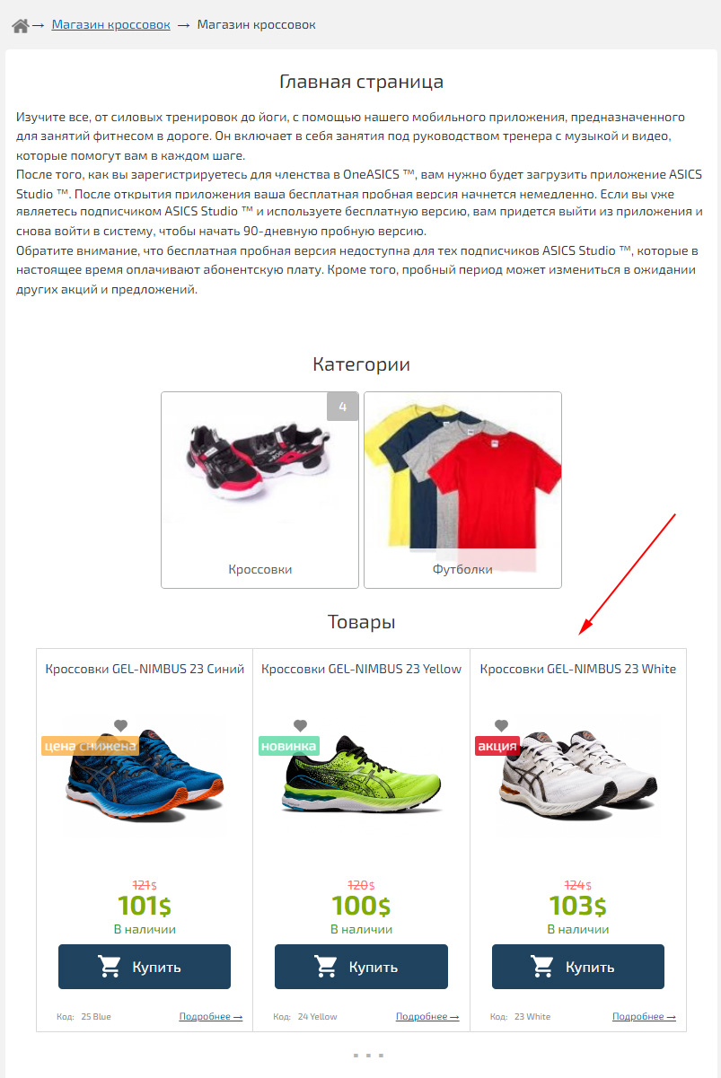 Добавлять товар рекомендуется в созданную вами категорию, например «Магазин» → «Кроссовки», это поможет создать понятную структуру вашего магазина.
