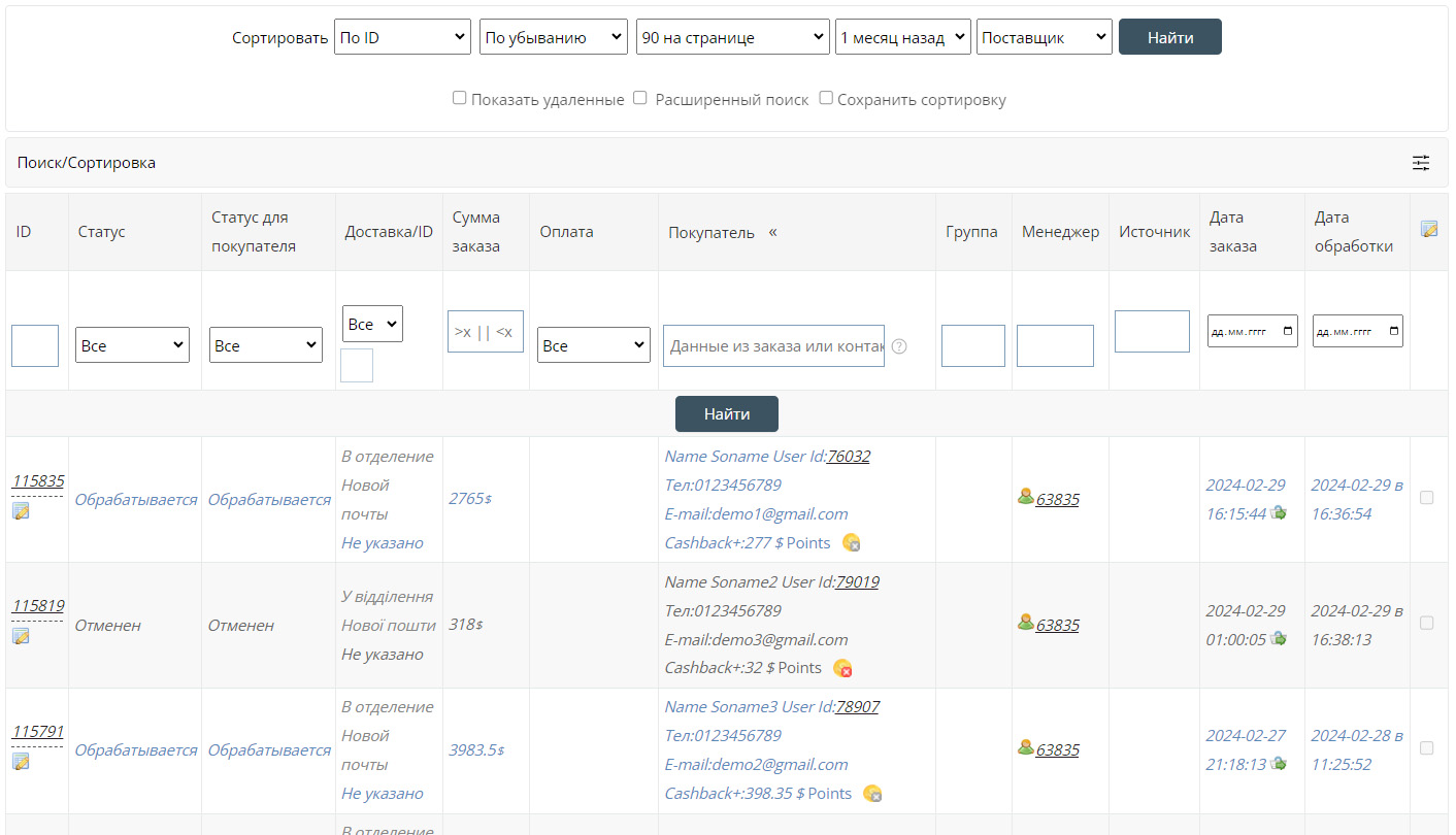 «Статистика продаж» содержит всю информацию о заказе, а также позволяет осуществлять его изменение, начислять «Cashback», отправлять «другие товарные предложения» покупателю, отслеживать все заказы одного посетителя, изменять статусы выполнения, оплаты и доставки...