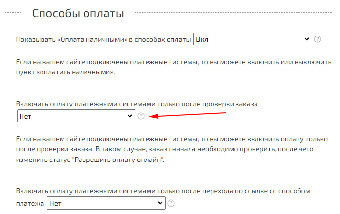 Параметры «Включения/Выключения оплаты заказа только после проверки» находятся в разделе «Настройки» - «Магазин» - «Валюта и оплата» - «Способы оплаты».