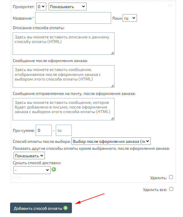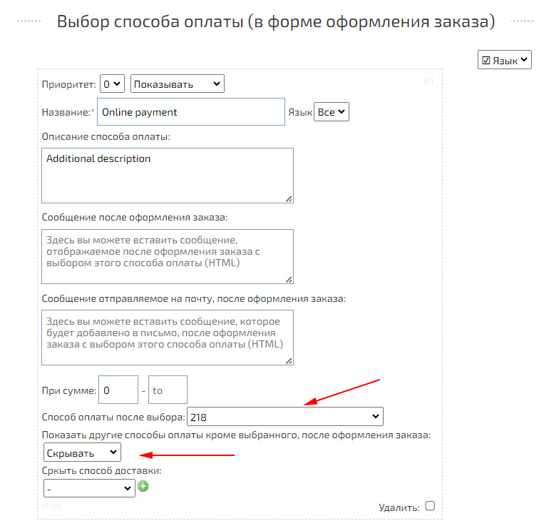 Кроме того, можно «Включить/Выключить» возможность выбора способа оплаты после оформления заказа. По умолчанию покупатель сможет выбрать любой из включенных способов оплаты.