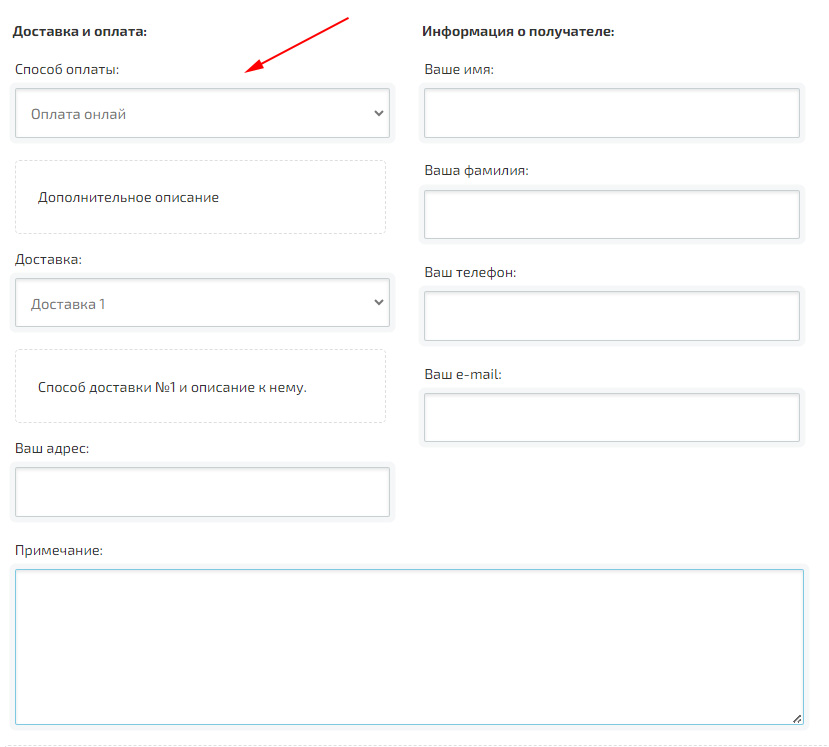 К способу оплаты можно указать конкретную платежную систему, а также добавить примечание.
