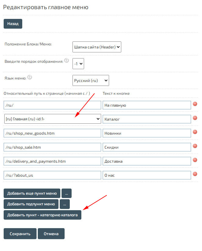Создать раскрывающийся пункт с категориями магазина вы можете нажав «Добавить пункт - категорию каталога».