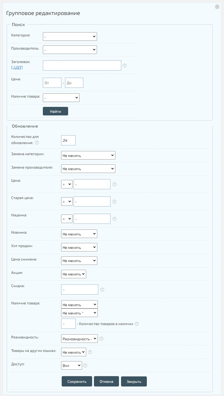 «Групповое редактирование» позволяет изменять «Категорию», «Наличие», «Цену», «Старую цену», «Указывать акции» (в том числе и таймер), а также осуществлять поиск по «Заголовку» и «Категории». Цену можно изменять «Математическим выражением» - умножением, делением, сложением, вычитанием, в том числе и процентов. «Старая цена» может быть указана на основании стоимости товара, также «Математическим выражением». «Наличие» можно указывать либо числом, либо «математическим выражением»: «+X» «-X».
