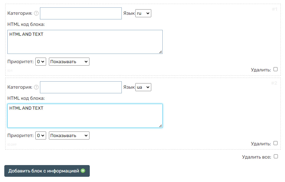 В нем можно указать как отображение во всех категориях, так и только для определенных категорий, заполнив в пункте «Категория» - наименование нужной категории. В примере выше в блок также добавлена информация об оплате.