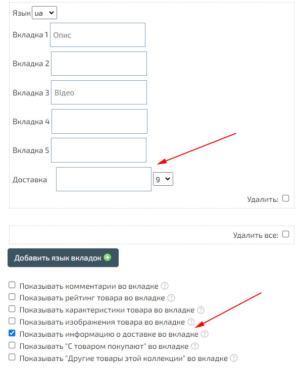 Для того, что бы отображать информацию о доставке во «Вкладках», перейдите в «Настройки» - «Магазин» - «Просмотр товара/Вкладки», и в пункте «Вкладки с дополнительным описанием» установите галочку «Показывать информацию о доставке во вкладке». При этом укажите порядковый номер вкладки, например – «9», для показа вкладки правее остальных вкладок. Аналогично вы можете включить отображение «Отзывов» во вкладке. Указать собственные названия «Вкладок» вы можете, нажав «Добавить язык вкладок».