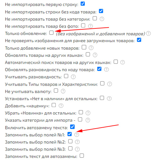 Выбранные ячейки можно сохранить, установив галочку «Запомнить выбор полей №1:» после чего, при следующем импорте можно быстро заполнить ячейки нажав «Заполнить выбор полей соответствий сохраненными ранее значениями (Сохраненные значения №1)».