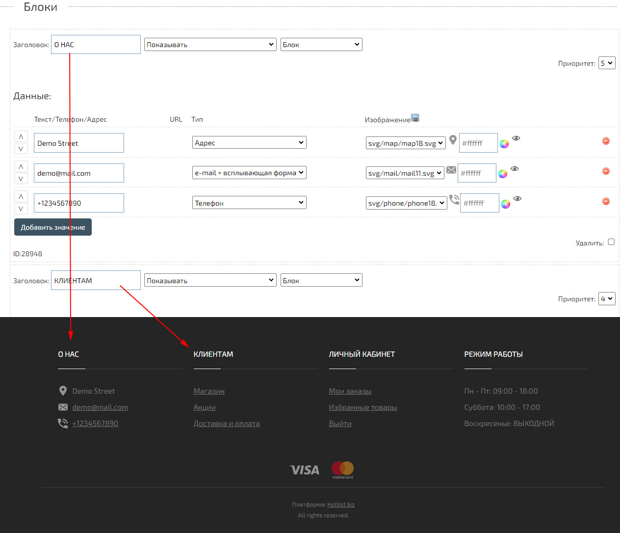 Упрощенный способ изменения контактной информации в Футере (низу сайта) реализован при помощи виджета «Footer_widget». В котором вы можете создавать или изменять блоки, указывать контактную информацию и иконки.